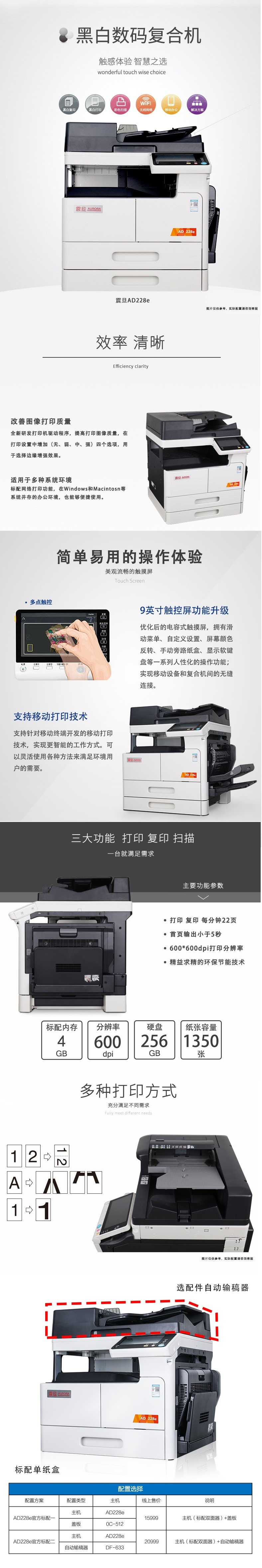 全新震旦2019新款A3數碼複合機 AD228e含雙面輸稿器 官方标配二 震旦最新款機器,結合了(le)彩色及高(gāo)速機的(de)配置,4G内存,雙核1.6Ghz CPU
